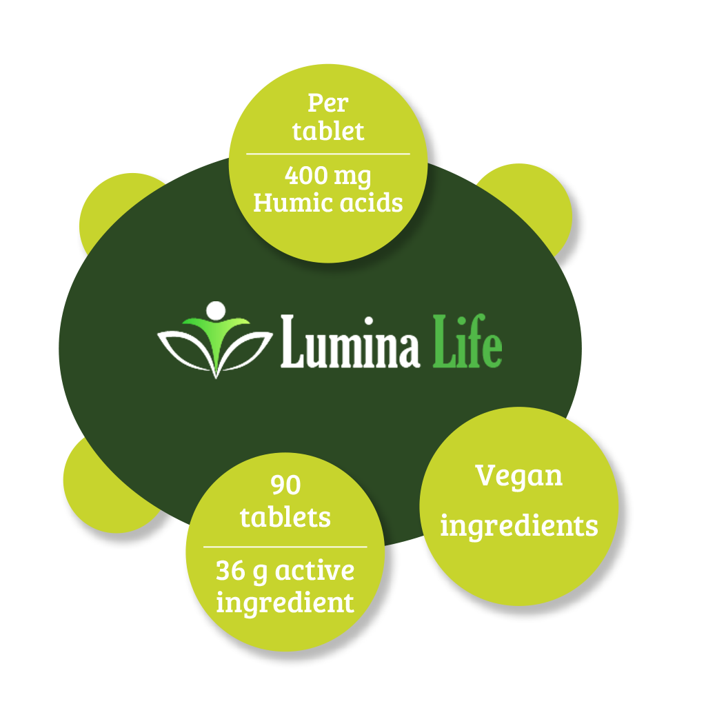 Ingredient per tablet: 400 mg humic and fulvic acids
